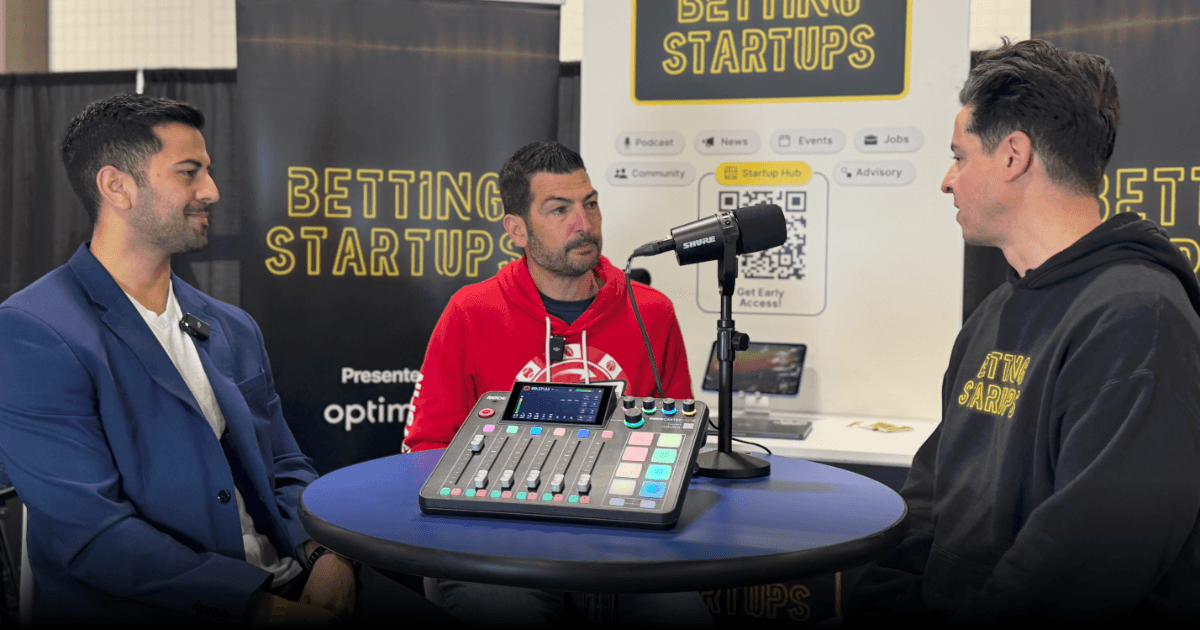 FantasySpin cofounders Sahil Patel (left) and Steve Happas (center) at SBC Americas 2025 recording an interview for The BettingStartups Podcast.