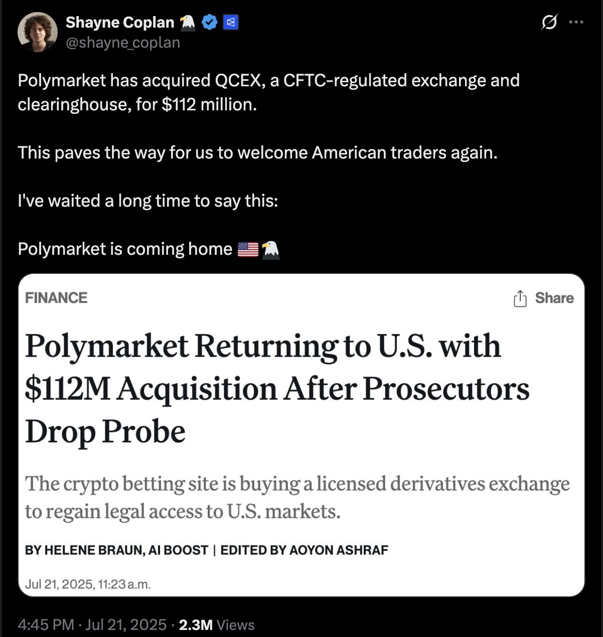 Polymarket has matched the momentum, reportedly in the process of closing a US$200 million round at a US$1 billion valuation led by Founders Fund. In July it agreed to acquire CFTC-licensed exchange QCEX for US$112 million. That purchase provides a compliant path back into the U.S., even if it requires segregating U.S. and international liquidity. Where Kalshi spent 6 years in the regulatory trenches, Polymarket is buying existing infrastructure, an option created by Kalshi's groundwork.