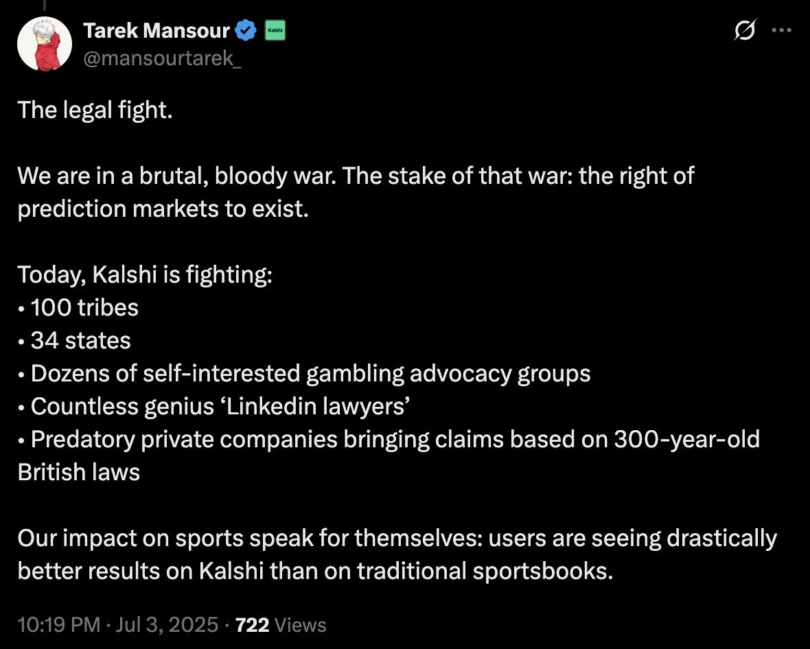 Kalshi CEO Tarek Mansour highlighting the legal challenges the company is facing. Source: X.com