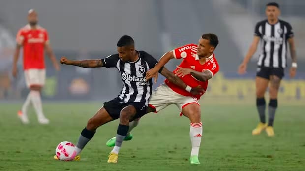 Tche Tche of Botafogo (sponsored by Blaze, one of Brazil’s largest betting companies) competes for the ball with Alan Patrick of Internacional. Source: Wagner Meier/Getty Images