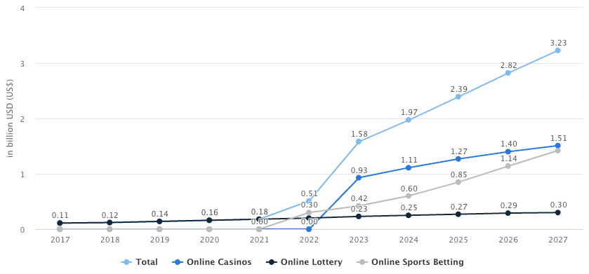 Brazil’s historic and forecast wagering revenue across online casino, online lottery and online sports betting. Source: Statista