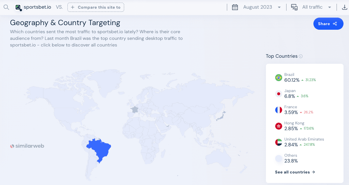 Stake, Sportsbet.io and BC.Game all count Brazil as a top 5 driver of website traffic, with Sportsbet.io attracting 60% of its global visitors from Brazil in August. Source: Similarweb