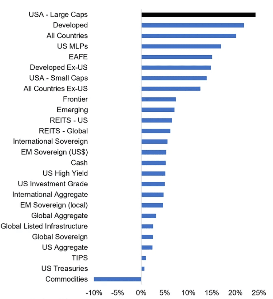 Performance of various asset classes and sectors in 2023. Source: Topdown Charts, Refinitiv Datastream