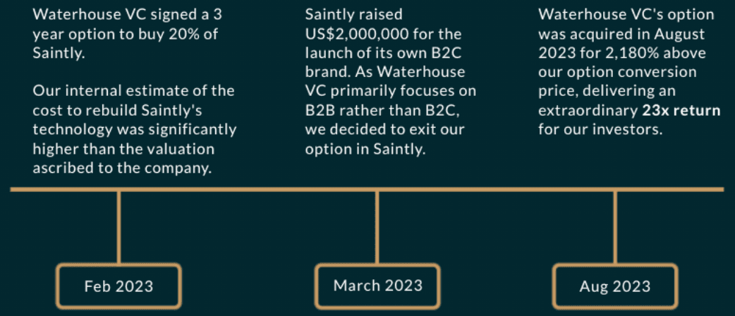 The timeline below shows the history of Waterhouse VC’s option deal with Saintly from signing in February 2023 through to exiting in August 2023 for 23 times the option conversion valuation.