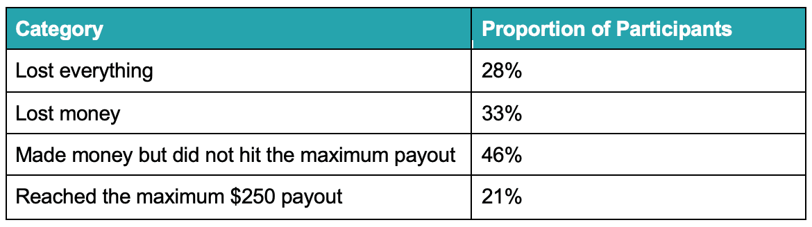 Haghani and Dewey calculated that 95% of people were expected to reach the $250 payout limit. But in the end, 33% of people lost money, and only 21% got to $250. 67% of people even tried their luck at least once betting on ‘Tails’ even though they had been told that ‘Tails’ only had a 40% chance of landing - an example of the ‘Illusion of Control’.