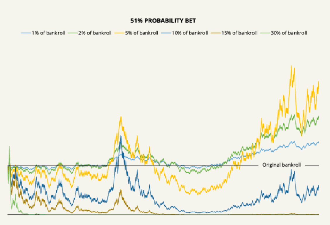 Another example highlighting the significance of the Kelly Criterion is presented above with a bet that has a 51% chance of winning. If you bet too cautiously (e.g. 2% of your money each time - refer to the green / second best performing line), you'll do okay but not great. If you bet too much (e.g. 15% of your money each time - refer to the brown / second worst performing line), you'll end up losing everything. This illustrates how crucial position sizing is in both betting and investing - small changes in how much you bet determine whether you succeed or lose everything.