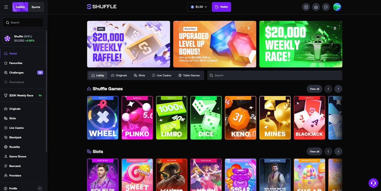 Shuffle’s casino user interface. Source: Shuffle.com