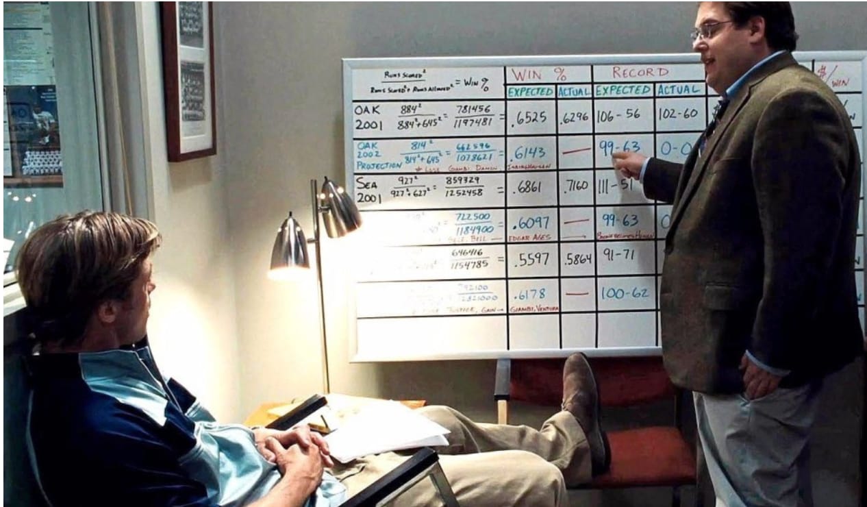 Jonah Hill (Peter Brand) walking Brad Pitt (Billy Bean) through the data in Moneyball. Source: Waydev.